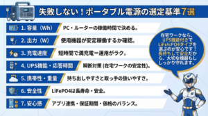 あなたがポータブル電源を選ぶ際に重視すべき点を7つに絞りました。1) 容量(Wh): ノートPCやルーターをどれくらい長く使いたいかで必要容量は変わります。2) 出力(W): ドライヤーや電気ケトルなど高出力機器を使うかどうかを確認してください。3) 充電速度: 短時間で満充電できるかは運用の自由度に直結します。4) UPS機能と応答時間: 在宅ワークでPCやネット機器を守るには無停電切り替えが重要です。5) 携帯性と重量: 非常時に持ち出す場面を想定するなら軽さと取っ手の扱いやすさを見てください。6) 安全性とバッテリー種類: リン酸鉄(LiFePO4)は長寿命・安全性でおすすめです。7) アプリ連携・保証・価格: リモート管理や保証期間は長期使用の安心に直結します。