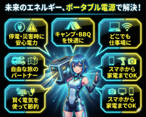 | キャンプ・車中泊 | ポータブル冷蔵庫や調理家電、スマホ充電を安定供給でき、夜間の快適さが増します。 |